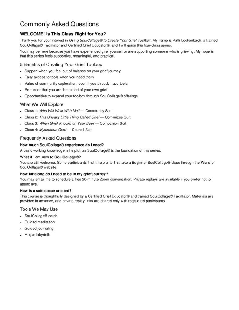 Please join me for this 4-Class Online Zoom Series which takes you on a gentle journey through all four SoulCollage® Suits. Included are: 4 monthly live and interactive 90-minute zoom sessions and a PDF Class Workbook. Your Printable Workbook includes your class handouts and exercises to support building your own personal Grief Toolbox.